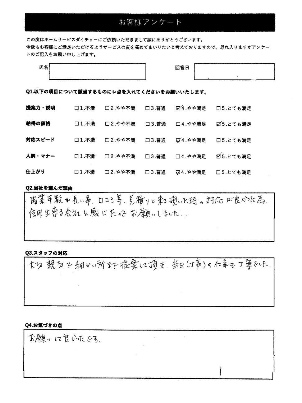 開業年数が長いこ事、口コミ等、見積もりに来て頂いた時の対応が良かった為、信用出来る会社と感じたのでお願いしました。